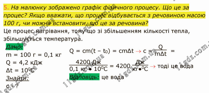 На малюнку зображено графік фізичного процесу. Що це за процес? Якщо вважати, що процес відбувається з речовиною масою 100 г, чи можна встановити, що це за речовина? Це процес нагрівання, тому що зі збільшенням кількості тепла, збільшується температура. Q = cm(t – t0) = cm∆t c = Qm∆t = 4200 Дж0,1 кг ● 100С = 4200 Джкг●0С тоді це вода Відповідь: це вода