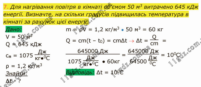 Для нагрівання повітря в кімнаті об’ємом 50 м3 витрачено 645 кДж енергії. Визначте, на скільки градусів підвищилась температура в кімнаті за рахунок цієї енергії. m = ρV = 1,2 кг/м3 ● 50 м3 = 60 кг Q = cm(t – t0) = cm∆t ∆t = Qсm = 645000 Дж 1075 Джкг●0С ● 60кг = 645000 Дж 64500 Дж0С = 100С Відповідь: ∆t = 100С