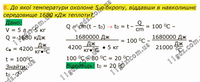 До якої температури охолоне 5 л окропу, віддавши в навколишнє середовище 1680 кДж теплоти? Q = cm(t – t0) t0 = t – Qсm = 100 0C – 1680000 Дж 4200 Джкг●0С ● 5 кг = 100 0C – 1680000 Дж 21000 Дж0С = 100 0C – 80 0C = 20 0С Відповідь: t0 = 20 0С