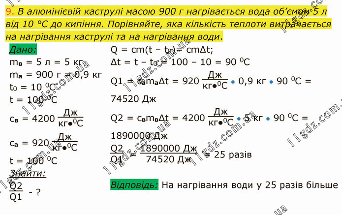В алюмінієвій каструлі масою 900 г нагрівається вода об’ємом 5 л від 10 °С до кипіння. Порівняйте, яка кількість теплоти витрачається на нагрівання каструлі та на нагрівання води. Q = cm(t – t0)= cm∆t; ∆t = t – t0 = 100 – 10 = 90 0С Q1 = cаmа∆t = 920 Джкг●0С ● 0,9 кг ● 90 0С = 74520 Дж Q2 = cвmв∆t = 4200 Джкг●0С ● 5 кг ● 90 0С = 1890000 Дж Q2Q1 = 1890000 Дж74520 Дж = 25 разів Відповідь: На нагрівання води у 25 разів більше