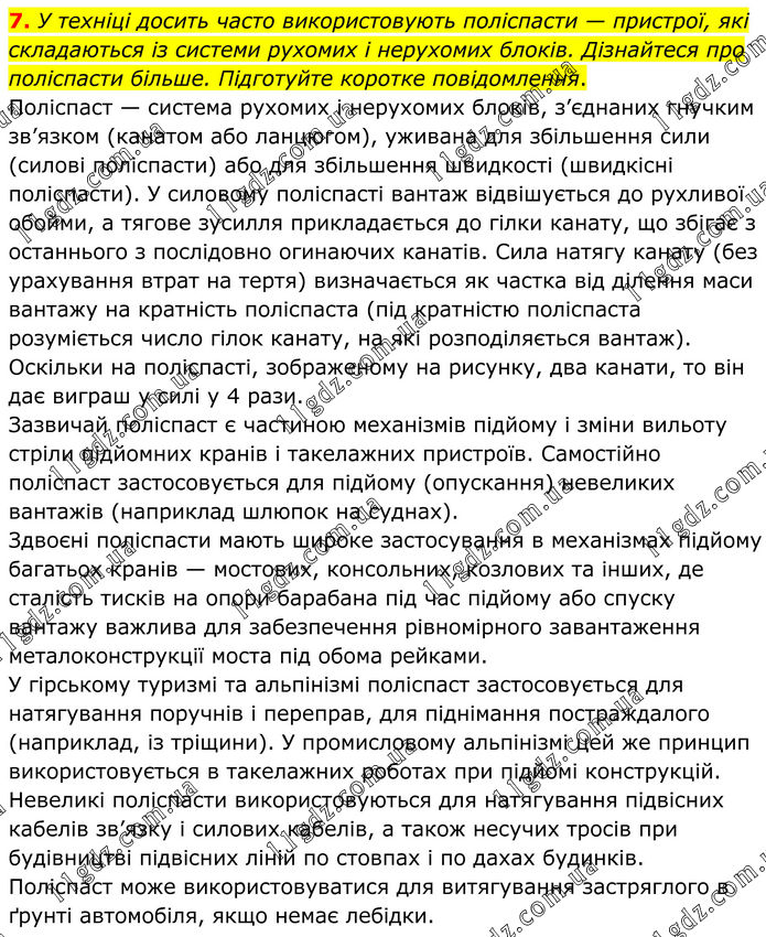 У техніці досить часто використовують поліспасти — пристрої, які складаються із системи рухомих і нерухомих блоків. Дізнайтеся про поліспасти більше. Підготуйте коротке повідомлення. Поліспаст — система рухомих і нерухомих блоків, з’єднаних гнучким зв’язком (канатом або ланцюгом), уживана для збільшення сили (силові поліспасти) або для збільшення швидкості (швидкісні поліспасти). У силовому поліспасті вантаж відвішується до рухливої обойми, а тягове зусилля прикладається до гілки канату, що збігає з останнього з послідовно огинаючих канатів. Сила натягу канату (без урахування втрат на тертя) визначається як частка від ділення маси вантажу на кратність поліспаста (під кратністю поліспаста розуміється число гілок канату, на які розподіляється вантаж). Оскільки на поліспасті, зображеному на рисунку, два канати, то він дає виграш у силі у 4 рази. Зазвичай поліспаст є частиною механізмів підйому і зміни вильоту стріли підйомних кранів і такелажних пристроїв. Самостійно поліспаст застосовується для підйому (опускання) невеликих вантажів (наприклад шлюпок на суднах). Здвоєні поліспасти мають широке застосування в механізмах підйому багатьох кранів — мостових, консольних, козлових та інших, де сталість тисків на опори барабана під час підйому або спуску вантажу важлива для забезпечення рівномірного завантаження металоконструкції моста під обома рейками. У гірському туризмі та альпінізмі поліспаст застосовується для натягування поручнів і переправ, для піднімання постраждалого (наприклад, із тріщини). У промисловому альпінізмі цей же принцип використовується в такелажних роботах при підйомі конструкцій. Невеликі поліспасти використовуються для натягування підвісних кабелів зв’язку і силових кабелів, а також несучих тросів при будівництві підвісних ліній по стовпах і по дахах будинків. Поліспаст може використовуватися для витягування застряглого в ґрунті автомобіля, якщо немає лебідки.