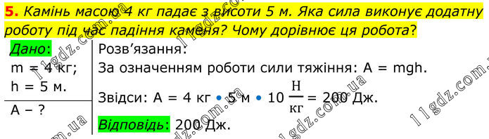 Камінь масою 4 кг падає з висоти 5 м. Яка сила виконує додатну роботу під час падіння каменя? Чому дорівнює ця робота? Дано: m = 4 кг; h = 5 м. Розв’язання: За означенням роботи сили тяжіння: А = mgh. Звідси: А = 4 кг • 5 м • 10 Н/кг = 200 Дж. Відповідь: 200 Дж. А – ?