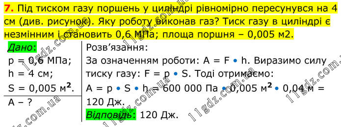 Під тиском газу поршень у циліндрі рівномірно пересунувся на 4 см (див. рисунок). Яку роботу виконав газ? Тиск газу в циліндрі є незмінним і становить 0,6 МПа; площа поршня – 0,005 м2. Дано: р = 0,6 МПа; h = 4 см; S = 0,005 м2. Розв’язання: За означенням роботи: А = F • h. Виразимо силу тиску газу: F = р • S. Тоді отримаємо: А = р • S • h = 600 000 Па • 0,005 м2 • 0,04 м = 120 Дж. Відповідь: 120 Дж. А – ?