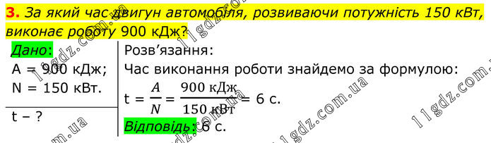За який час двигун автомобіля, розвиваючи потужність 150 кВт, виконає роботу 900 кДж? Дано: А = 900 кДж; N = 150 кВт. Розв’язання: Час виконання роботи знайдемо за формулою: t = A/N = (900 кДж)/(150 кВт) = 6 с. Відповідь: 6 с. t – ?