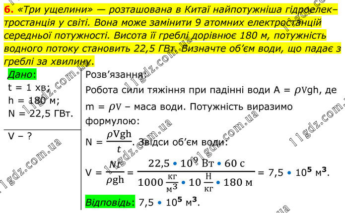 «Три ущелини» — розташована в Китаї найпотужніша гідроелек–тростанція у світі. Вона може замінити 9 атомних електростанцій середньої потужності. Висота її греблі дорівнює 180 м, потужність водного потоку становить 22,5 ГВт. Визначте об’єм води, що падає з греблі за хвилину. Дано: t = 1 хв; h = 180 м; N = 22,5 ГВт. Розв’язання: Робота сили тяжіння при падінні води А = ρVgh, де m = ρV – маса води. Потужність виразимо формулою: N = ρVgh/t. Звідси об’єм води: V = Nt/ρgh = (22,5 • 10^9 Вт • 60 с)/(1000 кг/м^3 • 10 Н/кг • 180 м ) = 7,5 • 105 м3. Відповідь: 7,5 • 105 м3. V – ?