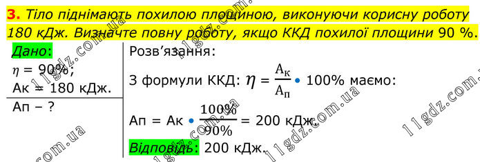 Тіло піднімають похилою площиною, виконуючи корисну роботу 180 кДж. Визначте повну роботу, якщо ККД похилої площини 90 %. Дано: η = 90%; Ак = 180 кДж. Розв’язання: З формули ККД: η = А_к/А_п • 100% маємо: Ап = Ак • (100%)/(90%) = 200 кДж. Відповідь: 200 кДж. Ап – ?