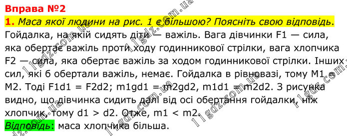 Маса якої людини на рис. 1 є більшою? Поясніть свою відповідь. Гойдалка, на якій сидять діти — важіль. Вага дівчинки F1 — сила, яка обертає важіль проти ходу годинникової стрілки, вага хлопчика F2 — сила, яка обертає важіль за ходом годинникової стрілки. Інших сил, які б обертали важіль, немає. Гойдалка в рівновазі, тому М1 = М2. Тоді F1d1 = F2d2; m1gd1 = m2gd2, m1d1 = m2d2. З рисунка видно, що дівчинка сидить далі від осі обертання гойдалки, ніж хлопчик, тому d1 > d2. Отже, m1 < m2. Відповідь: маса хлопчика більша.