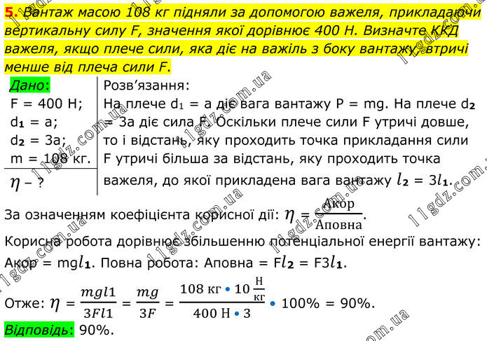 Вантаж масою 108 кг підняли за допомогою важеля, прикладаючи вертикальну силу F, значення якої дорівнює 400 Н. Визначте ККД важеля, якщо плече сили, яка діє на важіль з боку вантажу, втричі менше від плеча сили F. Дано: F = 400 Н; d1 = a; d2 = 3a; m = 108 кг. Розв’язання: На плече d1 = а діє вага вантажу Р = mg. На плече d2 = 3а діє сила F. Оскільки плече сили F утричі довше, то і відстань, яку проходить точка прикладання сили F утричі більша за відстань, яку проходить точка важеля, до якої прикладена вага вантажу l2 = 3l1. η – ? За означенням коефіцієнта корисної дії: η = Акор/Аповна. Корисна робота дорівнює збільшенню потенціальної енергії вантажу: Акор = mgl1. Повна робота: Аповна = Fl2 = F3l1. Отже: η = mgl1/3Fl1 = mg/3F = (108 кг • 10 Н/кг)/(400 Н • 3) • 100% = 90%. Відповідь: 90%.