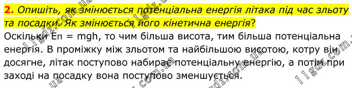 Опишіть, як змінюється потенціальна енергія літака під час зльоту та посадки. Як змінюється його кінетична енергія? Оскільки Еп = mgh, то чим більша висота, тим більша потенціальна енергія. В проміжку між зльотом та найбільшою висотою, котру він досягне, літак поступово набирає потенціальну енергію, а потім при заході на посадку вона поступово зменшується.