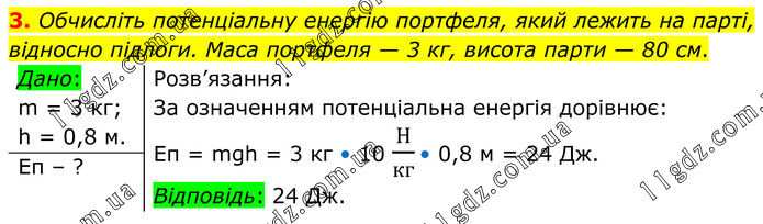 Обчисліть потенціальну енергію портфеля, який лежить на парті, відносно підлоги. Маса портфеля — 3 кг, висота парти — 80 см. Дано: m = 3 кг; h = 0,8 м. Розв’язання: За означенням потенціальна енергія дорівнює: Еп = mgh = 3 кг • 10 Н/кг • 0,8 м = 24 Дж. Відповідь: 24 Дж. Еп – ?