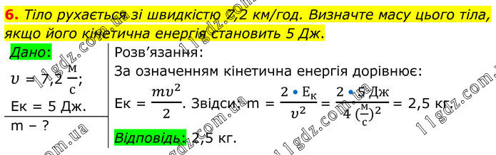 Тіло рухається зі швидкістю 7,2 км/год. Визначте масу цього тіла, якщо його кінетична енергія становить 5 Дж. Дано: υ = 7,2 м/с; Ек = 5 Дж. Розв’язання: За означенням кінетична енергія дорівнює: Ек = (mυ^2)/2. Звідси: m = (2 • Е_к)/υ^2 = (2 • 5 Дж)/(4 (м/с )^2 ) = 2,5 кг. Відповідь: 2,5 кг. m – ?