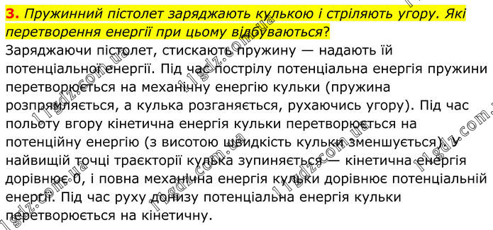 Пружинний пістолет заряджають кулькою і стріляють угору. Які перетворення енергії при цьому відбуваються? Заряджаючи пістолет, стискають пружину — надають їй потенціальної енергії. Під час пострілу потенціальна енергія пружини перетворюється на механічну енергію кульки (пружина розпрямляється, а кулька розганяється, рухаючись угору). Під час польоту вгору кінетична енергія кульки перетворюється на потенційну енергію (з висотою швидкість кульки зменшується). У найвищій точці траєкторії кулька зупиняється — кінетична енергія дорівнює 0, і повна механічна енергія кульки дорівнює потенціальній енергії. Під час руху донизу потенціальна енергія кульки перетворюється на кінетичну.