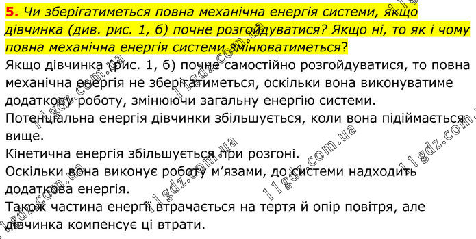 Чи зберігатиметься повна механічна енергія системи, якщо дівчинка (див. рис. 1, б) почне розгойдуватися? Якщо ні, то як і чому повна механічна енергія системи змінюватиметься? Якщо дівчинка (рис. 1, б) почне самостійно розгойдуватися, то повна механічна енергія не зберігатиметься, оскільки вона виконуватиме додаткову роботу, змінюючи загальну енергію системи. Потенціальна енергія дівчинки збільшується, коли вона підіймається вище. Кінетична енергія збільшується при розгоні. Оскільки вона виконує роботу м’язами, до системи надходить додаткова енергія. Також частина енергії втрачається на тертя й опір повітря, але дівчинка компенсує ці втрати.