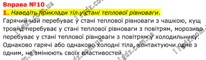 1. Наведіть приклади тіл у стані теплової рівноваги. Гарячий чай перебуває у стані тепло¬вої рівноваги з чашкою, кущ троянд перебуває у стані теплової рівноваги з повітрям, морозиво перебуває у стані теплової рівноваги з повітрям у холо¬дильнику. Однаково гарячі або одна¬ково холодні тіла, контактуючи одне з одним, не змінюють своїх властивостей.