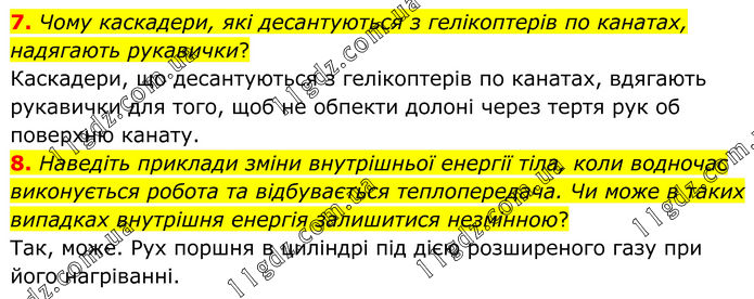7. Чому каскадери, які десантуються з гелікоптерів по канатах, надягають рукавички? Каскадери, що десантуються з гелі¬коптерів по канатах, вдягають рукави¬чки для того, щоб не обпекти долоні через тертя рук об поверхню канату. 8. Наведіть приклади зміни внутрішньої енергії тіла, коли водночас виконується робота та відбувається теплопередача. Чи може в таких випадках внутрішня енергія залишитися незмінною? Так, може. Рух поршня в циліндрі під дією розширеного газу при його на¬гріванні.