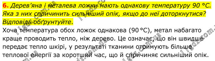 6. Дерев’яна і металева ложки мають однакову температуру 90 °C. Яка з них спричинить сильніший опік, якщо до неї доторкнутися? Відповідь обґрунтуйте. Хоча температура обох ложок однакова (90 °C), метал набагато краще проводить тепло, ніж дерево. Це означає, що він швидше передає тепло шкірі, у результаті тканини отримують більше теплової енергії за коротший час, що й спричиняє сильніший опік.