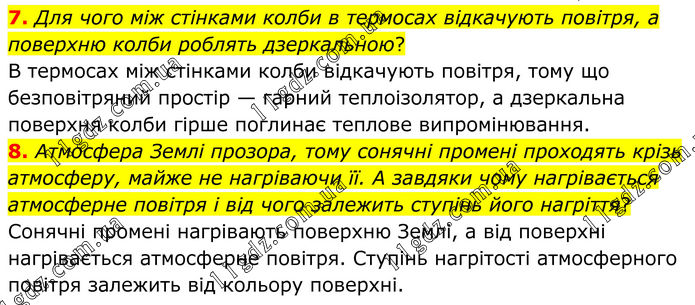 7. Для чого між стінками колби в термосах відкачують повітря, а поверхню колби роблять дзеркальною? В термосах між стінками колби відка¬чують повітря, тому що безповітряний простір — гарний теплоізолятор, а дзер¬кальна поверхня колби гірше поглинає теплове випромінювання. 8. Атмосфера Землі прозора, тому сонячні промені проходять крізь атмосферу, майже не нагріваючи її. А завдяки чому нагрівається атмосферне повітря і від чого залежить ступінь його нагріття? Сонячні промені нагрівають поверх¬ню Землі, а від поверхні нагрівається атмосферне повітря. Ступінь нагрітості атмосферного повітря залежить від ко¬льору поверхні.