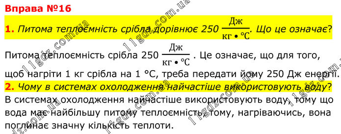 Вправа №16 1. Питома теплоємність срібла дорівнює 250 Дж/(кг • ℃). Що це означає? Питома теплоємність срібла 250 Дж/(кг • ℃) . Це означає, що для того, щоб нагріти 1 кг срібла на 1 °С, треба передати йому 250 Дж енергії. 2. Чому в системах охолодження найчастіше використовують воду? В системах охолодження найчастіше використовують воду, тому що вода має найбільшу питому теплоємність, тому, нагріваючись, вона поглинає значну кількість теплоти.