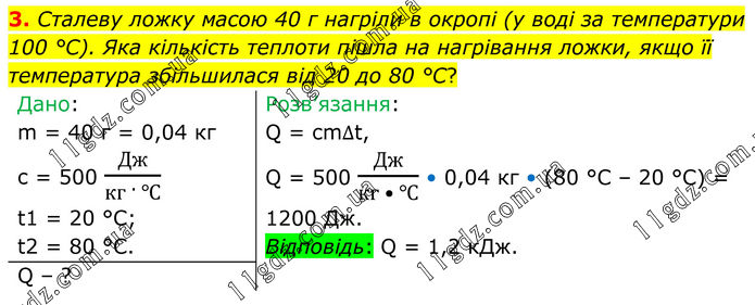 3. Сталеву ложку масою 40 г нагріли в окропі (у воді за температури 100 °С). Яка кількість теплоти пішла на нагрівання ложки, якщо її температура збільшилася від 20 до 80 °С? Дано: m = 40 г = 0,04 кг c = 500 Дж/(кг · ℃) t1 = 20 °С; t2 = 80 °С. Розв’язання: Q = cm∆t, Q = 500 Дж/(кг • ℃) • 0,04 кг • (80 °С – 20 °С) = 1200 Дж. Відповідь: Q = 1,2 кДж. Q – ?