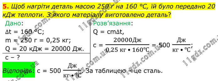 5. Щоб нагріти деталь масою 250 г на 160 °С, їй було передано 20 кДж теплоти. З якого матеріалу виготовлено деталь? Дано: ∆t = 160 °С; m = 250 г = 0,25 кг; Q = 20 кДж = 20000 Дж. Розв’язання: Q = cm∆t, с = 20000Дж/(0,25 кг • 160℃) = 500 Дж/(кг • ℃); с – ? Відповідь: с = 500 Дж/(кг • ℃). За таблицею – це сталь.