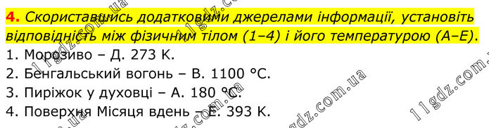 4. Скориставшись додатковими джерелами інформації, установіть відповідність між фізичним тілом (1–4) і його температурою (А–Е). 1. Морозиво – Д. 273 K. 2. Бенгальський вогонь – В. 1100 °С. 3. Пиріжок у духовці – А. 180 °С. 4. Поверхня Місяця вдень – E. 393 K.