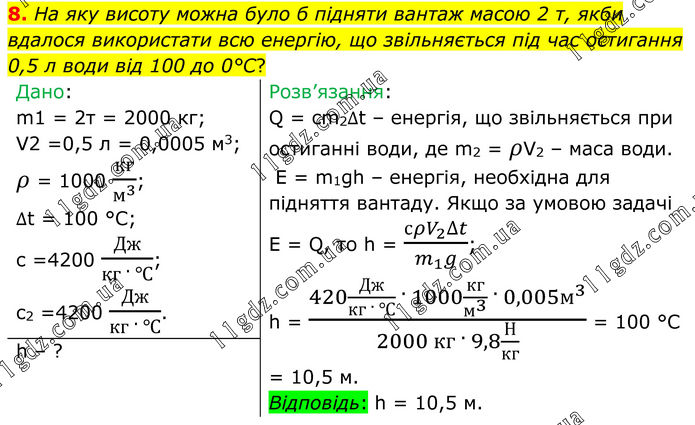 8. На яку висоту можна було б підняти вантаж масою 2 т, якби вдалося використати всю енергію, що звільняється під час остигання 0,5 л води від 100 до 0°С? Дано: m1 = 2т = 2000 кг; V2 =0,5 л = 0,0005 м3; ρ = 1000 кг/м^3 ; ∆t = 100 °С; c =4200 Дж/(кг · ℃); c2 =4200 Дж/(кг · ℃). Розв’язання: Q = cm2∆t – енергія, що звільняється при остиганні води, де m2 = ρV2 – маса води. E = m1gh – енергія, необхідна для підняття вантаду. Якщо за умовою задачі Е = Q, то h = (сρV_2 ∆t)/(m_1 g); h = (420 Дж/(кг · ℃) · 1000 кг/м^3 · 0,005м^3)/(2000 кг · 9,8 Н/кг) = 100 °С = 10,5 м. Відповідь: h = 10,5 м. h – ?