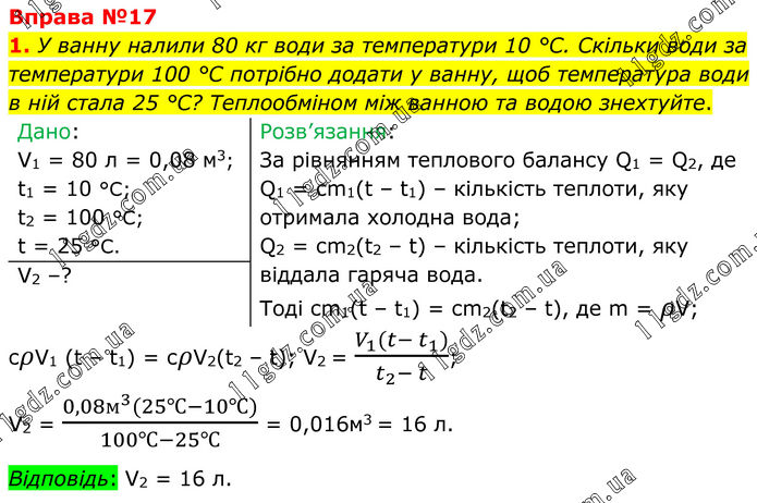 Вправа №17 1. У ванну налили 80 кг води за температури 10 °С. Скільки води за температури 100 °С потрібно додати у ванну, щоб температура води в ній стала 25 °С? Теплообміном між ванною та водою знехтуйте. Дано: V1 = 80 л = 0,08 м3; t1 = 10 °C; t2 = 100 °C; t = 25 °C. Розв’язання: За рівнянням теплового балансу Q1 = Q2, де Q1 = сm1(t – t1) – кількість теплоти, яку отримала холодна вода; Q2 = сm2(t2 – t) – кількість теплоти, яку віддала гаряча вода. Тоді cm1(t – t1) = cm2(t2 – t), де m = ρV; V2 –? cρV1 (t – t1) = cρV2(t2 – t); V2 = (V_1 (t- t_1))/(t_2- t); V2 = (0,08м^3 (25℃-10℃))/(100℃-25℃) = 0,016м3 = 16 л. Відповідь: V2 = 16 л.