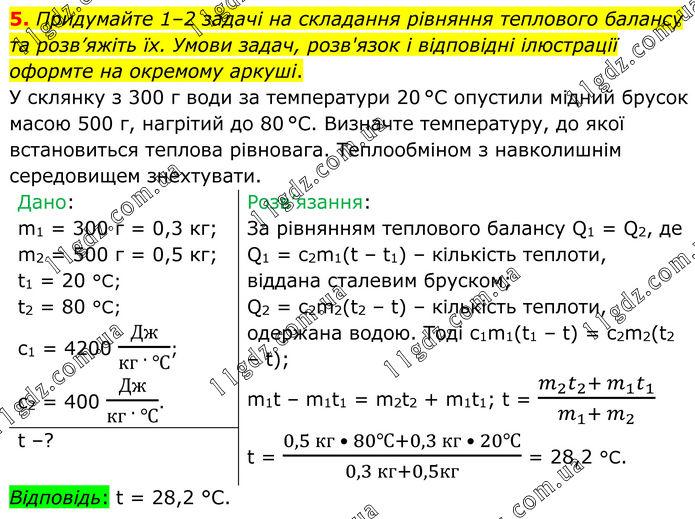 5. Придумайте 1–2 задачі на складання рівняння теплового балансу та розв’яжіть їх. Умови задач, розв'язок і відповідні ілюстрації оформте на окремому аркуші. У склянку з 300 г води за температури 20 °C опустили мідний брусок масою 500 г, нагрітий до 80 °C. Визначте температуру, до якої встановиться теплова рівновага. Теплообміном з навколишнім середовищем знехтувати. Дано: m1 = 300 г = 0,3 кг; m2 = 500 г = 0,5 кг; t1 = 20 °C; t2 = 80 °C; c1 = 4200 Дж/(кг · ℃); c2 = 400 Дж/(кг · ℃). Розв’язання: За рівнянням теплового балансу Q1 = Q2, де Q1 = c2m1(t – t1) – кількість теплоти, віддана сталевим бруском; Q2 = c2m2(t2 – t) – кількість теплоти, одержана водою. Тоді c1m1(t1 – t) = c2m2(t2 – t); m1t – m1t1 = m2t2 + m1t1; t = (m_2 t_2+ m_1 t_1)/(m_1+ m_2 ) t = (0,5 кг • 80℃+0,3 кг • 20℃)/(0,3 кг+0,5кг) = 28,2 °C. t –? Відповідь: t = 28,2 °C.