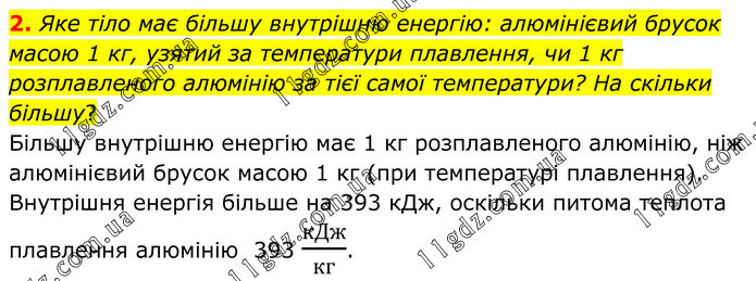 2. Яке тіло має більшу внутрішню енергію: алюмінієвий брусок масою 1 кг, узятий за температури плавлення, чи 1 кг розплавленого алюмінію за тієї самої температури? На скільки більшу? Більшу внутрішню енергію має 1 кг розплавленого алюмінію, ніж алюмінієвий брусок масою 1 кг (при температурі плавлення). Внутрішня енергія більше на 393 кДж, оскільки питома теплота плавлення алюмінію 393 кДж/кг.