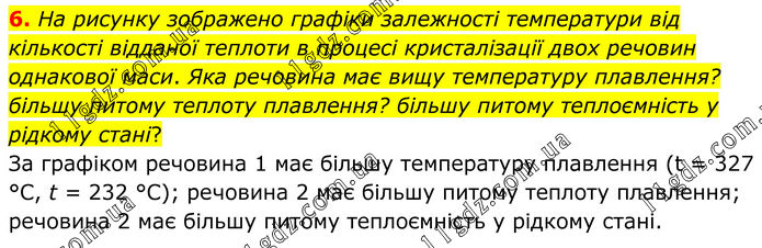 6. Нa рисунку зображено графіки залежності температури від кількості відданої теплоти в процесі кристалізації двох речовин однакової маси. Яка речовина має вищу температуру плавлення? більшу питому теплоту плавлення? більшу питому теплоємність у рідкому стані? За графіком речовина 1 має більшу температуру плавлення (t = 327 °С, t = 232 °С); речовина 2 має більшу питому теплоту плавлення; речовина 2 має біль¬шу питому теплоємність у рідкому стані.