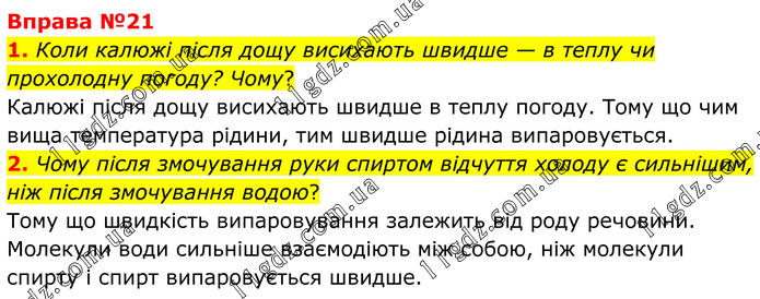 Вправа №21 1. Коли калюжі після дощу висихають швидше — в теплу чи прохолодну погоду? Чому? Калюжі після дощу висихають швид¬ше в теплу погоду. Тому що чим вища температура рідини, тим швидше ріди¬на випаровується. 2. Чому після змочування руки спиртом відчуття холоду є сильнішим, ніж після змочування водою? Тому що швидкість випаровування залежить від роду речовини. Молекули води сильніше взаємо¬діють між собою, ніж молекули спирту і спирт випаровується швидше.