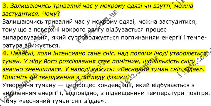 3. Залишаючись тривалий час у мокрому одязі чи взутті, можна застудитися. Чому? Залишаючись тривалий час у мокро¬му одязі, можна застудитися, тому що з поверхні мокрого одягу відбувається процес випаровування, який супроводжується поглинанням енергії і темпе-ратура знижується. 4. Навесні, коли інтенсивно тане сніг, над полями іноді утворюється туман. У міру його розсіювання стає помітним, що кількість снігу значно зменшилася. У народі кажуть: «Весняний туман сніг з’їдає». Поясніть це твердження з погляду фізики. Утворення туману — це процес кон¬денсації, який відбувається з виділенням енергії і, відповідно, з підвищенням температури повітря. Тому «весняний туман сніг з’їдає».