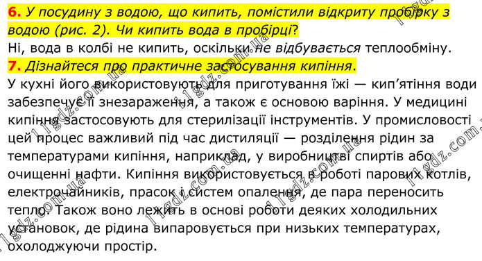 6. У посудину з водою, що кипить, помістили відкриту пробірку з водою (рис. 2). Чи кипить вода в пробірці? Ні, вода в колбі не кипить, оскільки не відбувається теплообміну. 7. Дізнайтеся про практичне застосування кипіння. У кухні його використовують для приготування їжі — кип’ятіння води забезпечує її знезараження, а також є основою варіння. У медицині кипіння застосовують для стерилізації інструментів. У промисловості цей процес важливий під час дистиляції — розділення рідин за температурами кипіння, наприклад, у виробництві спиртів або очищенні нафти. Кипіння використовується в роботі парових котлів, електрочайників, прасок і систем опалення, де пара переносить тепло. Також воно лежить в основі роботи деяких холодильних установок, де рідина випаровується при низьких температурах, охолоджуючи простір.
