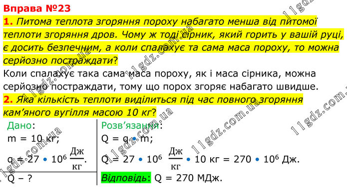 Вправа №23 1. Питома теплота згоряння пороху набагато менша від питомої теплоти згоряння дров. Чому ж тоді сірник, який горить у вашій руці, є досить безпечним, а коли спалахує та сама маса пороху, то можна серйозно постраждати? Коли спалахує така сама маса поро¬ху, як і маса сірника, можна серйозно постраждати, тому що порох згоряє на¬багато швидше. 2. Яка кількість теплоти виділиться під час повного згоряння кам’яного вугілля масою 10 кг? Дано: m = 10 кг; q = 27 • 106 Дж/кг. Розв’язання: Q = q • m; Q = 27 • 106 Дж/кг • 10 кг = 270 • 106 Дж. Відповідь: Q = 270 МДж. Q – ?