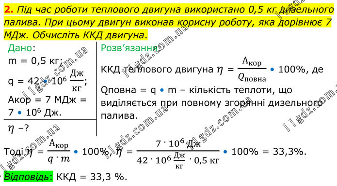 2. Під час роботи теплового двигуна використано 0,5 кг дизельного палива. При цьому двигун виконав корисну роботу, яка дорівнює 7 МДж. Обчисліть ККД двигуна. Дано: m = 0,5 кг; q = 42 • 106 Дж/кг; Акор = 7 МДж = 7 • 106 Дж. Розв’язання: ККД теплового двигуна η = А_кор/Q_повна • 100%, де Qповна = q • m – кількість теплоти, що виділяється при повному згорянні дизельного палива. η –? Тоді η = А_кор/(q · m) • 100%, η = (7 · 10^(6 ) Дж)/(42 · 10^(6 ) Дж/кг · 0,5 кг) • 100% = 33,3%. Відповідь: ККД = 33,3 %.