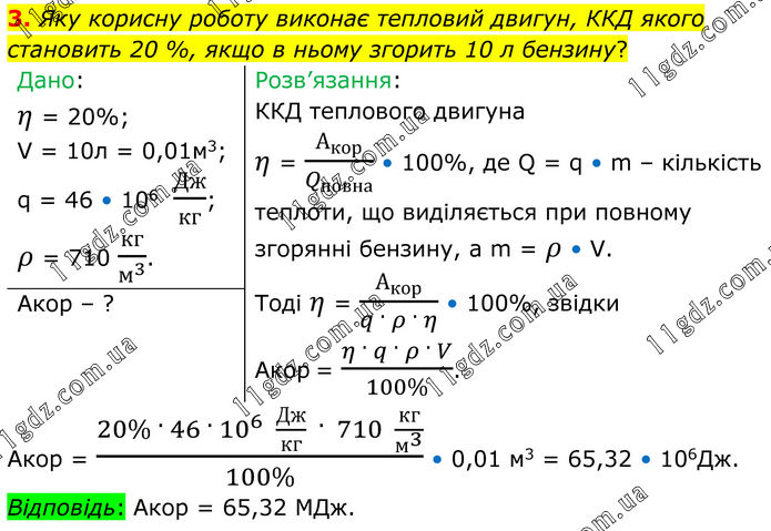 3. Яку корисну роботу виконає тепловий двигун, ККД якого становить 20 %, якщо в ньому згорить 10 л бензину? Дано: η = 20%; V = 10л = 0,01м3; q = 46 • 106 Дж/кг; ρ = 710 кг/м^3 . Розв’язання: ККД теплового двигуна η = А_кор/Q_повна • 100%, де Q = q • m – кількість теплоти, що виділяється при повному згорянні бензину, а m = ρ • V. Тоді η = А_кор/(q · ρ · η) • 100%, звідки Акор = (η · q · ρ · V)/(100%). Акор – ? Акор = (20% · 46 · 10^6 Дж/кг · 710 кг/м^3 )/(100%) • 0,01 м3 = 65,32 • 106Дж. Відповідь: Акор = 65,32 МДж.