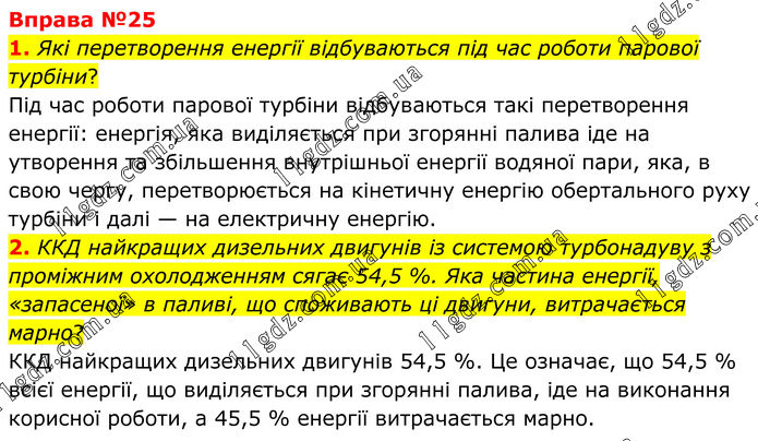 Вправа №25 1. Які перетворення енергії відбуваються під час роботи парової турбіни? Під час роботи парової турбіни відбуваються такі перетворення енергії: енергія, яка виділяється при згорянні палива іде на утворення та збільшення внутрішньої енергії водяної пари, яка, в свою чергу, перетворюється на кінетичну енергію обертального руху турбіни і далі — на електричну енергію. 2. ККД найкращих дизельних двигунів із системою турбонадуву з проміжним охолодженням сягає 54,5 %. Яка частина енергії, «запасеної» в паливі, що споживають ці двигуни, витрачається марно? ККД найкращих дизельних двигунів 54,5 %. Це означає, що 54,5 % всієї енергії, що виділяється при згорянні палива, іде на виконання корисної роботи, а 45,5 % енергії витрачається марно.