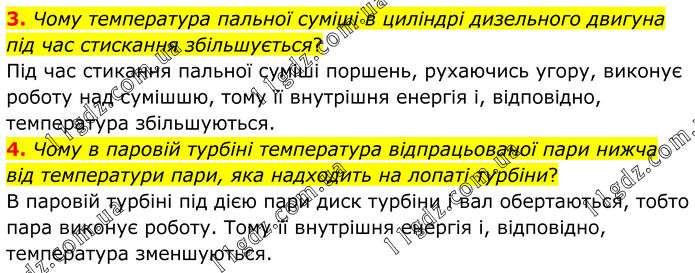 3. Чому температура пальної суміші в циліндрі дизельного двигуна під час стискання збільшується? Під час стикання пальної суміші поршень, рухаючись угору, виконує роботу над сумішшю, тому її внутрішня енергія і, відповідно, температура збільшуються. 4. Чому в паровій турбіні температура відпрацьованої пари нижча від температури пари, яка надходить на лопаті турбіни? В паровій турбіні під дією пари диск турбіни і вал обертаються, тобто пара виконує роботу. Тому її внутрішня енергія і, відповідно, температура зменшуються.