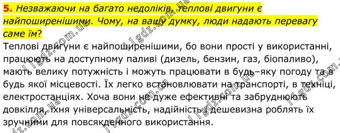 5. Незважаючи на багато недоліків, теплові двигуни є найпоширенішими. Чому, на вашу думку, люди надають перевагу саме їм? Теплові двигуни є найпоширенішими, бо вони прості у використанні, працюють на доступному паливі (дизель, бензин, газ, біопаливо), мають велику потужність і можуть працювати в будь–яку погоду та в будь якої місцевості. Їх легко встановлювати на транспорті, в техніці, електростанціях. Хоча вони не дуже ефективні та забруднюють довкілля, їхня універсальність, надійність і дешевизна роблять їх зручними для повсякденного використання.