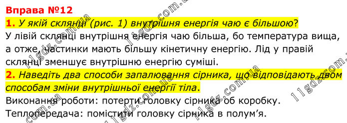 Вправа №12 1. У якій склянці (рис. 1) внутрішня енергія чаю є більшою? У лівій склянці внутрішня енергія чаю більша, бо температура вища, а отже, частинки мають більшу кінетичну енергію. Лід у правій склянці зменшує внутрішню енергію суміші. 2. Наведіть два способи запалювання сірника, що відповідають двом способам зміни внутрішньої енергії тіла. Виконання роботи: потерти головку сірника об коробку. Теплопередача: по¬містити головку сірника в полум’я.