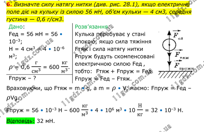 6. Визначте силу натягу нитки (див. рис. 28.1), якщо електричне поле діє на кульку із силою 56 мН, об’єм кульки — 4 см3, середня густина — 0,6 г/см3. Дано: Fед = 56 мН = 56 • 10–3; Н = 4 см3 = 4 • 10–6 м3; ρ = 0,6 г/〖см〗^3 = 600 кг/м^3 . Розв’язання: Кулька перебуває у стані спокою, якщо сила тяжіння Fтяж і сила натягу нитки Fпруж будуть скомпенсовані електричною силою Fед , тобто: Fтяж + Fпруж = Fед. Fпруж = Fед – Fтяж. Fпруж – ? Враховуючи, що Fтяж = m • g, a m = ρ • V, маємо: Fпруж = Fед – ρVg. Fпруж = 56 • 10–3 H – 600 кг/м^3 • 4 • 106 м3 • 10 Н/кг = 32 • 10–3 H. Відповідь: 32 мН.
