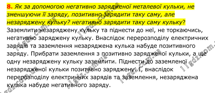 8. Як за допомогою негативно зарядженої металевої кульки, не зменшуючи її заряду, позитивно зарядити таку саму, але незаряджену кульку? негативно зарядити таку саму кульку? Заземлити незаряджену кульку та піднести до неї, не торкаючись, негативно заряджену кульку. Внаслідок перерозподілу електричних зарядів та заземлення незаряджена кулька набуде позитивного заряду. Прибрати заземлення з позитивно зарядженої кульки, а ще одну незаряджену кульку заземлити. Піднести до заземленої незарядженої кульки позитивно заряджену. І, внаслідок перерозподілу електричних зарядів та заземлення, незаряджена кулька набуде негативного заряду.