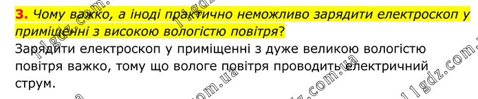 3. Чому важко, а іноді практично неможливо зарядити електроскоп у приміщенні з високою вологістю повітря? Зарядити електроскоп у приміщенні з дуже великою вологістю повітря важко, тому що вологе повітря проводить електричний струм.