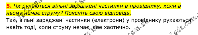 5. Чи рухаються вільні заряджені частинки в провіднику, коли в ньому немає струму? Поясніть свою відповідь. Так, вільні заряджені частинки (електрони) у провіднику рухаються навіть тоді, коли струму немає, але хаотично.