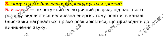 3. Чому спалах блискавки супроводжується громом? Блискавка — це потужний електричний розряд, під час цього розряду виділяється величезна енергія, тому повітря в каналі блискавки нагрівається і різко розширюється, що призводить до виникнення звуку.