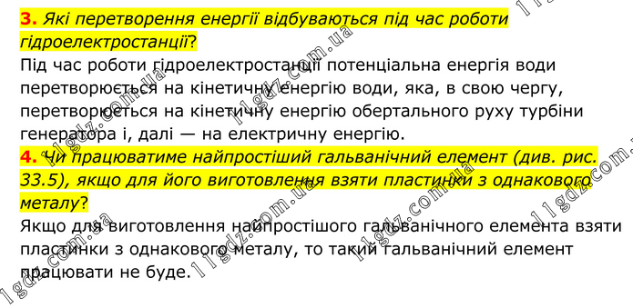 3. Які перетворення енергії відбуваються під час роботи гідроелектростанції? Під час роботи гідроелектростанції потенціальна енергія води перетворюється на кінетичну енергію води, яка, в свою чергу, перетворюється на кінетичну енергію обертального руху турбіни генератора і, далі — на електричну енергію. 4. Чи працюватиме найпростіший гальванічний елемент (див. рис. 33.5), якщо для його виготовлення взяти пластинки з однакового металу? Якщо для виготовлення найпростішого гальванічного елемента взяти пластинки з однакового металу, то такий гальванічний елемент працювати не буде.