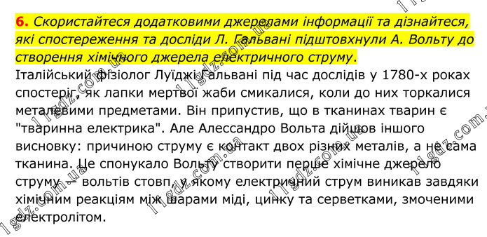 6. Скористайтеся додатковими джерелами інформації та дізнайтеся, які спостереження та досліди Л. Гальвані підштовхнули А. Вольту до створення хімічного джерела електричного струму. Італійський фізіолог Луїджі Гальвані під час дослідів у 1780-х роках спостеріг, як лапки мертвої жаби смикалися, коли до них торкалися металевими предметами. Він припустив, що в тканинах тварин є "тваринна електрика". Але Алессандро Вольта дійшов іншого висновку: причиною струму є контакт двох різних металів, а не сама тканина. Це спонукало Вольту створити перше хімічне джерело струму — вольтів стовп, у якому електричний струм виникав завдяки хімічним реакціям між шарами міді, цинку та серветками, змоченими електролітом.