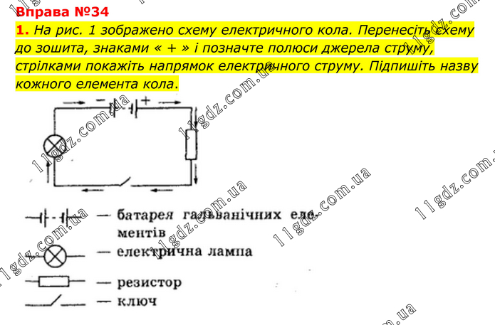 Вправа №34 1. На рис. 1 зображено схему електричного кола. Перенесіть схему до зошита, знаками « + » і позначте полюси джерела струму, стрілками покажіть напрямок електричного струму. Підпишіть назву кожного елемента кола.