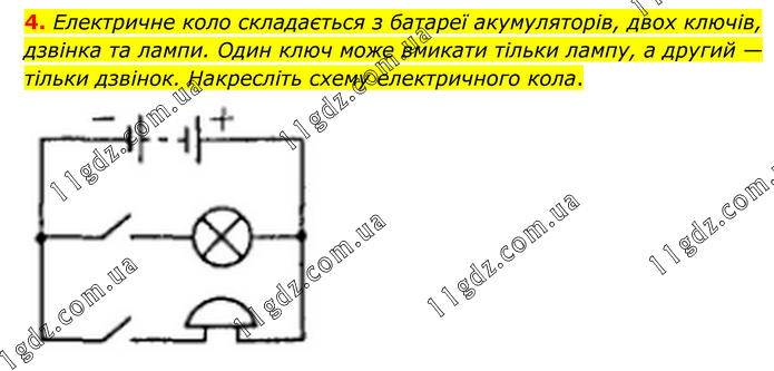 4. Електричне коло складається з батареї акумуляторів, двох ключів, дзвінка та лампи. Один ключ може вмикати тільки лампу, а другий — тільки дзвінок. Накресліть схему електричного кола.