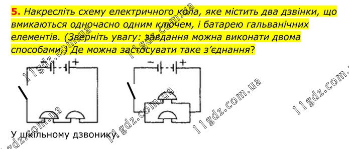 Накресліть схему електричного кола, яке містить два дзвінки, що вмикаються одночасно одним ключем, і батарею гальванічних елементів. (Зверніть увагу: завдання можна виконати двома способами.) Де можна застосувати таке з’єднання? У шкільному дзвонику.
